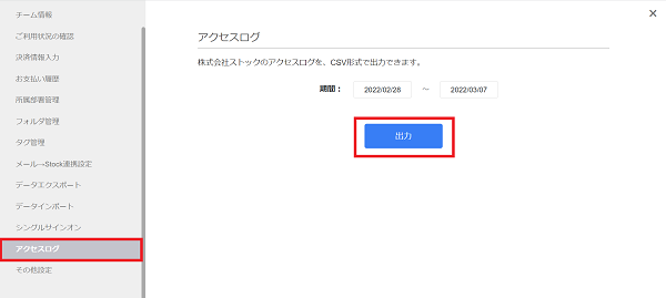 ②左メニューの「アクセスログ」から、指定期間内のアクセスログが出力できます。