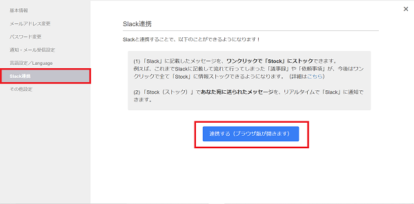 ②画面左側メニューの「Slack連携」を開き、「連携する」をクリックすると、ブラウザ版のStockに遷移し設定できるようになります。