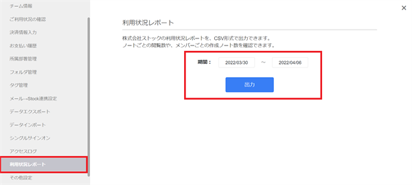 ②左側メニューの「利用状況レポート」をクリックし、出力期間を入力後、「出力」をクリックします。
