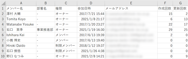 ⑤usage_report_members.csvでは、メンバーごとの「ノート作成回数」「ノート更新回数」を確認できます。