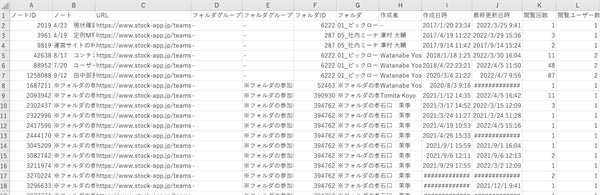 ⑥usage_report_stocks.csvでは、ノートごとの「閲覧回数」「閲覧ユーザー数」を確認できます。