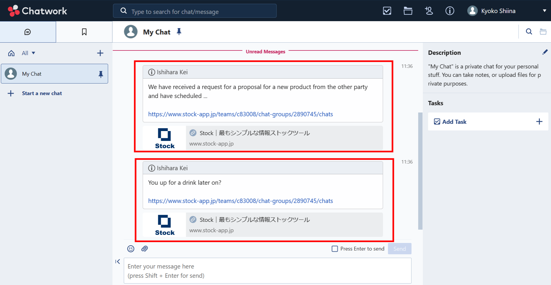 6. From then on, Chatwork will be notified of messages received by Stock. In addition to messages from users, you will also be notified of notifications from the Stock support desk. Clicking on the link will open the corresponding message group.