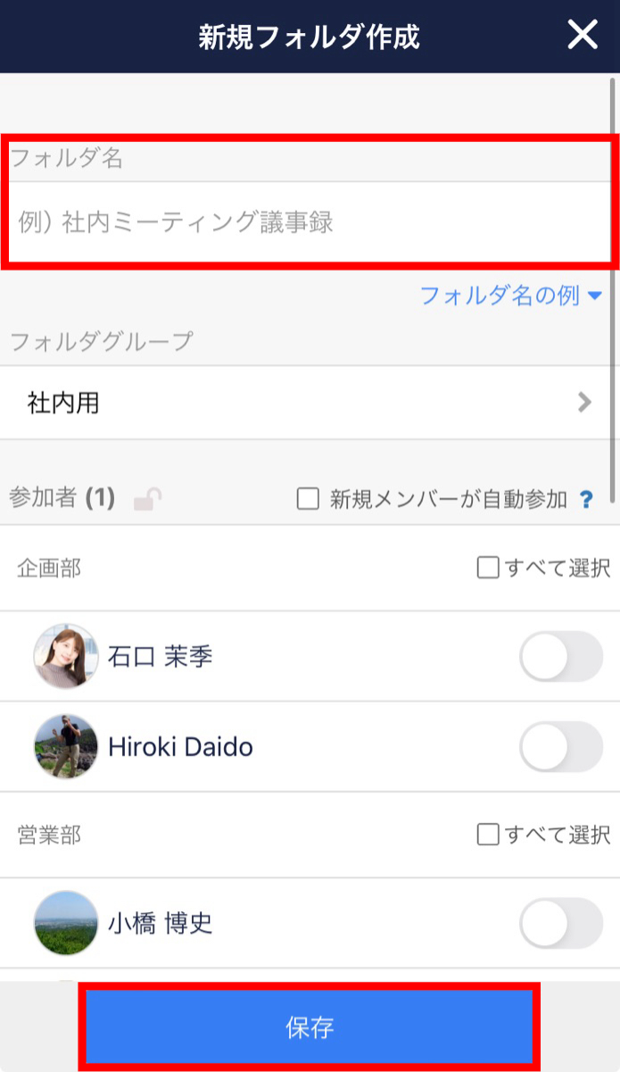 ⑤「フォルダ名」を入力し、「保存」ボタンをタップします。